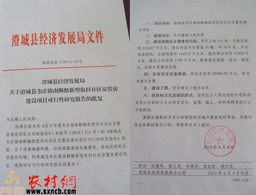 澄政經發(fā)(2013)50號《澄城縣經濟發(fā)展局關于韋莊鎮(zhèn)南酥酪新型農村社區(qū)安置房建設項目可行性研究報告的批復》