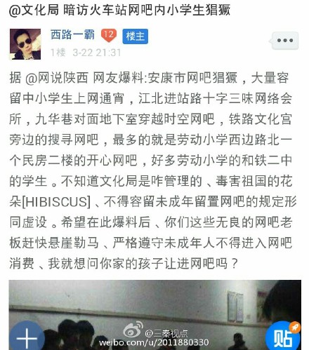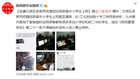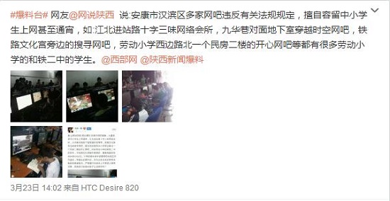 據(jù)新浪微博爆料:安康市漢濱區(qū)多家網(wǎng)吧違反有關法規(guī)規(guī)定,擅自容留中小學生上網(wǎng)甚至通宵,如:江北進站路十字三味網(wǎng)絡會所,九華巷對面地下室穿越時空網(wǎng)吧,鐵路文化宮旁邊的搜尋網(wǎng)吧,勞動小學西邊路北一個民房二樓的開心網(wǎng)吧等都有很多勞動小學的和鐵二中的學生。