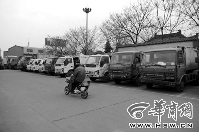 2月27日下午2時許,華商報記者發(fā)現(xiàn),西安市蓮湖區(qū)環(huán)衛(wèi)車隊停車場停放了各種環(huán)衛(wèi)車輛,包括灑水車、掃地車、垃圾清運車、治污減霾車等,車輛新舊不一?!坝械能囈延惺隁v史?!避囮犓緳C(jī)說,“車況特別差,有一次開著開著,輪子掉了。”