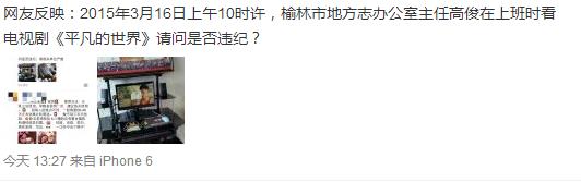 據(jù)新浪微博爆料:網(wǎng)友反映:2015年3月16日上午10時許,榆林市地方志辦公室主任高俊在上班時看電視劇《平凡的世界》請問是否違紀?