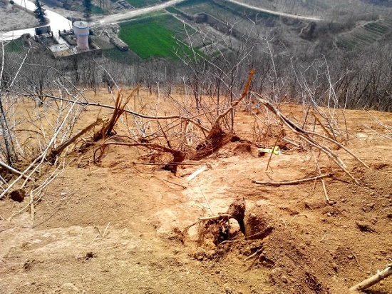 沿坡而上,只見坡面上大量樹木被修廟時推土機(jī)推下的黃土掩埋。廟宇下一個被推土機(jī)推出的平臺旁,好幾棵胳膊粗的松樹、柏樹被連根拔起后已被風(fēng)干。站在這個平臺上往下看,數(shù)十畝坡面上展現(xiàn)的不是樹根朝上的,就是東倒西歪只露出樹梢的成林樹木痕跡。