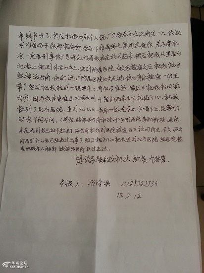 我叫馮清泉、我是榆林市米脂縣村民。我在榆林開了一個小賓館,2015年3月10日鼓樓派出所在一幫土匪趙飛隊長的帶領(lǐng)下,不分青紅皂白的闖入了我的賓館帶走了我,然后用手銬(背銬)銬住我,將我押回鼓樓派出所,把我吊在二架床上,鼓樓派出所執(zhí)法違法,在王維清和胡正云(派出所正副所長)的監(jiān)督下,對我嚴(yán)刑逼供,拳打腳踢,致殘本人腰部,逼供未成,看到我已站不起來,派出所抬我到附屬醫(yī)院檢查,結(jié)果他們官官相賄,說我身體一切正常,后又拉回所里,不久,派出所看到打得我已經(jīng)違法出事了,隨后撥打120,把我送到北方醫(yī)院,經(jīng)醫(yī)院檢查致殘本人腰部,鼓樓派出所執(zhí)法違法。