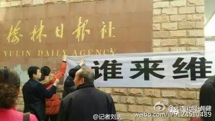 微博消息稱,昨日上午,榆林日報都市生活版(原榆林晚報)員工在榆林日報社門前拉起橫幅,向股東討要被拖欠的數(shù)千元到上萬元不等工資。今年農(nóng)歷年前夕,榆林晚報突然休刊整頓,員工被迫下崗。