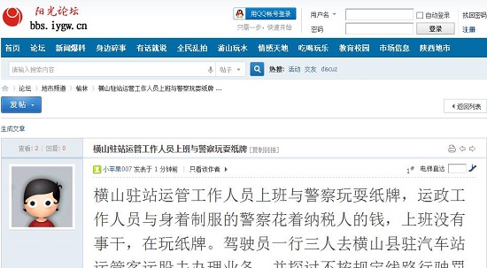 不知道橫山縣駐汽車站運(yùn)管客運(yùn)股領(lǐng)導(dǎo)人看后有何感想?也不知道運(yùn)政工作人員與那名身著制服的警察看后丈有何感想?你們花著納稅人的錢,上班玩紙牌,不知道橫山縣是怎樣進(jìn)行機(jī)關(guān)作風(fēng)整頓的?期待紀(jì)檢部門給予社會一個(gè)明確答復(fù)!
