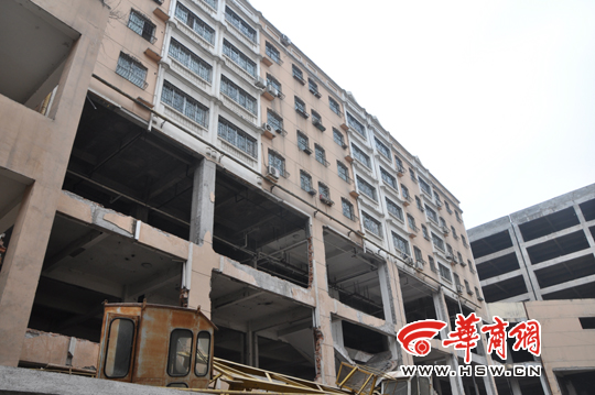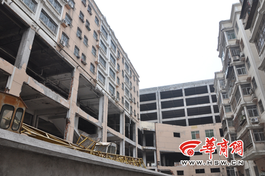 6日,華商報(bào)記者在現(xiàn)場(chǎng)看到,均利廣場(chǎng)空中花園4號(hào)樓有3個(gè)單元,1至3層是商鋪,上面4層是住戶,共有24戶住戶,下面3層樓體拆得只剩主要框架,遠(yuǎn)遠(yuǎn)看去,上面的居民家就像是懸在半空一樣。