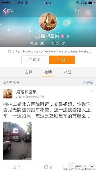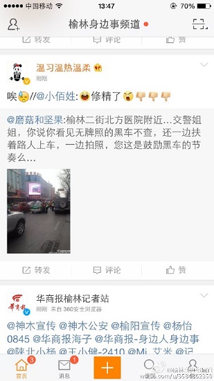 據(jù)新浪微博爆料:榆林二街北方醫(yī)院附近…交警姐姐,你說你看見無(wú)牌照的黑車不查,還一邊扶著路人上車,一邊拍照,您這是鼓勵(lì)黑車的節(jié)奏么…
