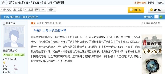 山陽縣教育局規(guī)定:山陽中學將于正月十六日至十七日兩天時間開學,十八日正式開學,現(xiàn)如今還不到十五,山陽中學便在大年初七當天開始進行違規(guī)補課,嚴重危害摧殘了我們學生的身心健康。學校本來是一個教書育人的地方,學生在學校的目的是快樂學習成長的,但學校一味的追求成績,不顧學生的意見公然進行了補課,這些天本來應該是我們學生休息調(diào)整的日子,但卻被學校用來補課。學校曾教過我們要遵紀守法,但是學校卻明知故犯,這樣用身心健康換來的成績,我們不要!希望教育部門盡快對此做出處理,換我們學生一個快樂的暑期!