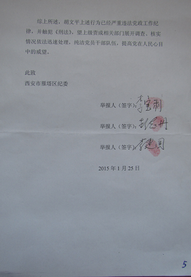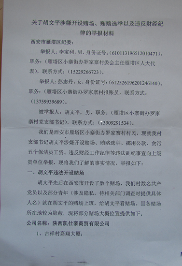 我們是西安市雁塔區(qū)小寨街辦羅家寨村村民,現(xiàn)就我村支部書記胡文平涉嫌開設賭場、賄賂選舉、挪用公款、貪污五個保潔員工資、違反財經(jīng)工作紀律等違法亂紀事宜向上級貴單位舉報,現(xiàn)將我們了解的事實情況,舉報如下: