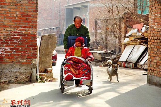 姚富國(guó)推著母親在村子里散步。