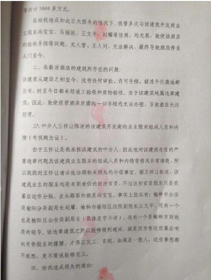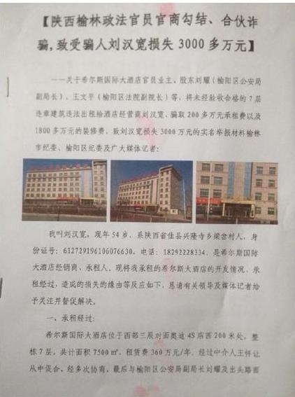 據(jù)新浪微博爆料:佳縣劉漢寬實(shí)名舉報(bào)榆陽區(qū)法院副院長(zhǎng)王文平等多名榆林官員股東,將未經(jīng)驗(yàn)收合格的希爾斯國(guó)際大酒店違章建筑出租給經(jīng)營(yíng)商,騙取200多萬承包費(fèi)及1800多萬裝修費(fèi),導(dǎo)致經(jīng)營(yíng)商損失高達(dá)3000多萬。