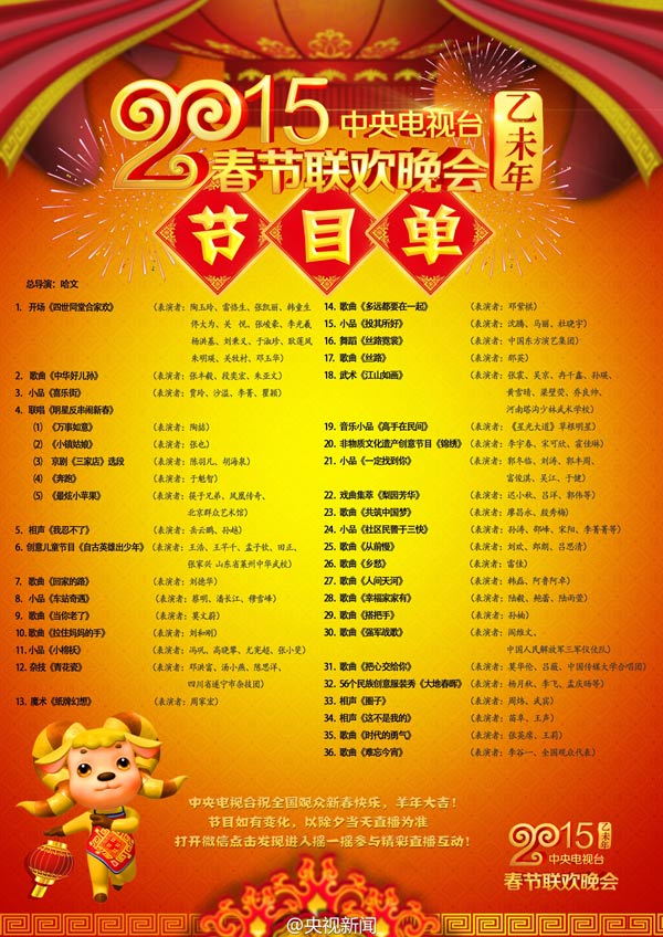 2月17日凌晨,央視春晚官方微博發(fā)布節(jié)目單,并稱:“【春晚節(jié)目單權(quán)威發(fā)布】經(jīng)過(guò)羊年春晚六次彩排后的節(jié)目調(diào)整與修改,2015年中央電視臺(tái)春節(jié)聯(lián)歡晚會(huì)權(quán)威敲定版節(jié)目單今夜出爐!節(jié)目如有變化,以除夕當(dāng)天直播為準(zhǔn)。中央電視臺(tái)祝全國(guó)觀眾新春快樂(lè),羊年大吉!轉(zhuǎn)發(fā)收藏之!”