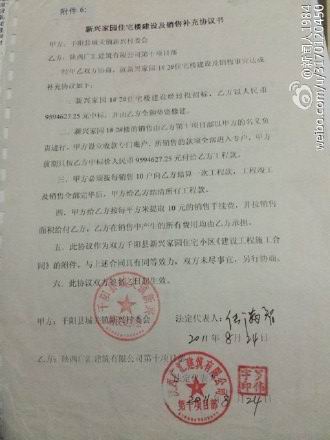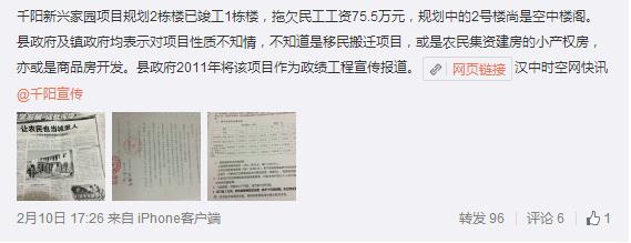 據(jù)新浪微博爆料:千陽新興家園項(xiàng)目規(guī)劃2棟樓已竣工1棟樓,拖欠民工工資75.5萬元,規(guī)劃中的2號(hào)樓尚是空中樓閣??h政府及鎮(zhèn)政府均表示對(duì)項(xiàng)目性質(zhì)不知情,不知道是移民搬遷項(xiàng)目,或是農(nóng)民集資建房的小產(chǎn)權(quán)房,亦或是商品房開發(fā)??h政府2011年將該項(xiàng)目作為政績(jī)工程宣傳報(bào)道。@千陽宣傳