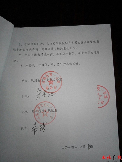 下午2:00記者來到鳳翔縣國土資源局了解情況,一位工作人員給記者出示了一份陜西省人民政府審批土地件,陜西政土批[2014]223號文件,關于鳳翔縣2014年度第二批農用地轉用土地征收的批復,批復中同意將鳳翔縣鄉(xiāng)級土地總體規(guī)劃確定的建設用地規(guī)模范圍的陳村鎮(zhèn),糜桿橋鎮(zhèn)等村34.56公頃農用地轉為建設用地,以此來搪塞記者,說是陜西晟達銅雕有限公司有土地手續(xù)。當記者提出要看的是銅雕有限公司項目用地審批許可證時,一位杜姓負責人稱:“陜西晟達銅雕有限公司目前沒有用地手續(xù),相關用地手續(xù)正在辦理當中?!痹诮o記者出示的縣征地中心與鎮(zhèn)政府簽訂的征地協(xié)議書,記者看到,該宗土地12.642畝,位于十里鋪二組。于2014年6月14日,經鳳翔縣人民政府第7次常務會議研究,每畝地連同地上的附著物及青苗補償,補償村民53000元/畝,共計670026元,一次性全部以銀行轉帳方式兌付給村民。征地協(xié)議還明確規(guī)定:此宗土地未經批準前,不得進行施工,不得改變土地原貌。當記者質疑征地協(xié)議明確要求,“要全額把征地款兌付到村民手中,為什么村民說只拿到4萬元,剩余的13000元為啥不給村民兌付?”杜姓負責人稱:“剩余的13000元未給村民兌付,主要是村民土地上的附屬物及青苗,征地村民代表等都需要費用?!碑斢浾咛岢鰶]有土地手續(xù)能否動工時,屬不屬于未批先建時,該負責人稱:“該項目是縣上的文化項目?!?