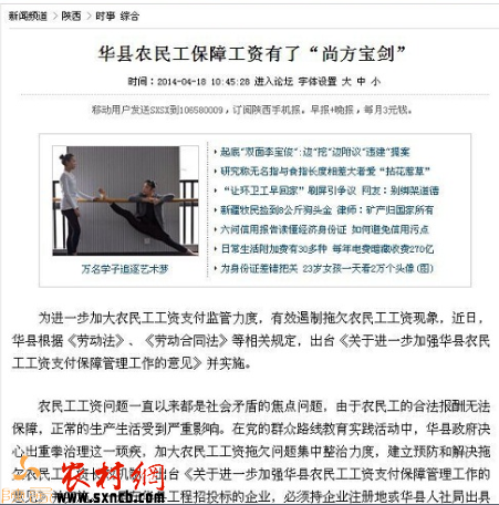 年關(guān)將至,各種拖欠農(nóng)民工工資之事頻現(xiàn)媒體。廣大農(nóng)民工朋友辛辛苦苦掙來的血汗錢卻無法拿到,極大地刺傷了農(nóng)民工的心。而據(jù)媒體2014年4月報道,華縣人民政府根據(jù)《勞動法》、《勞動合同法》等相關(guān)規(guī)定,出臺了《關(guān)于進(jìn)一步加強華縣農(nóng)民工工資支付保障管理工作的意見》并予以實施。該意見指出:將繳納農(nóng)民工工資保證金作為辦理工程施工許可的前置條件;推行農(nóng)民工實名制管理,用人單位必須依法與勞動者簽訂勞動合同,明確工資支付標(biāo)準(zhǔn)、方式和時間,建立花名冊,并向人社部門辦理用工登記備案;縣人社局、公安局等部門每季度開展一次欠薪隱患排查專題會議,建立預(yù)警檔案,確定監(jiān)控對象等作為保障農(nóng)民工工資的有效措施。