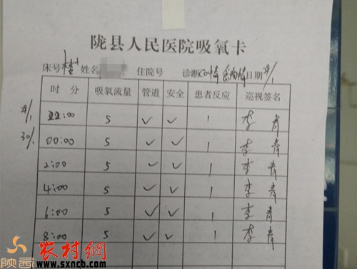 隴縣人民醫(yī)院內(nèi)一科10號病房32床、+32床患者的吸氧卡上顯示:診斷患者的病因是Co中毒食物中毒(Co為一氧化碳)。隨后,電話采訪韋某蔣的主治醫(yī)生,醫(yī)生表示病情為血紅蛋白高、瞳孔小、大小便失禁、有機(jī)磷中毒。