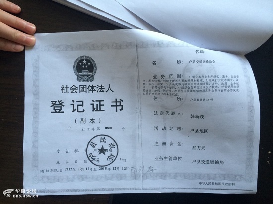 戶(hù)縣民政局民政科的薛姓工作人員則告訴記者,他們按照工作制度工作,戶(hù)縣交通運(yùn)輸協(xié)會(huì)備案資料齊全。同時(shí)為記者出示了相關(guān)資料,資料顯示,戶(hù)縣交通運(yùn)輸協(xié)會(huì)業(yè)務(wù)主管單位為戶(hù)縣交通運(yùn)輸局,由陜西省戶(hù)縣運(yùn)輸公司和西安戶(hù)縣通源運(yùn)輸有限公司于2008年4月15日向戶(hù)縣交通運(yùn)輸局發(fā)起“關(guān)于籌備戶(hù)縣道路運(yùn)輸協(xié)會(huì)的申請(qǐng)”,并于當(dāng)日批復(fù)申請(qǐng);2014年10月27日社會(huì)團(tuán)體法人登記證書(shū)上的法定代表人為南孝君;在編號(hào)為1203的社會(huì)團(tuán)體法人登記表上記者看到經(jīng)費(fèi)來(lái)源一項(xiàng)寫(xiě)著“會(huì)費(fèi)”兩個(gè)字。當(dāng)記者提到關(guān)于戶(hù)縣交通運(yùn)輸協(xié)會(huì)亂收取會(huì)費(fèi)這個(gè)問(wèn)題時(shí),薛姓工作人員僅表示他們目前已經(jīng)按照國(guó)家規(guī)定對(duì)社會(huì)團(tuán)體進(jìn)行了整改。