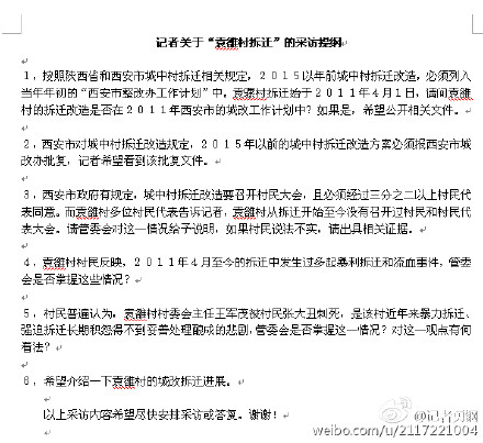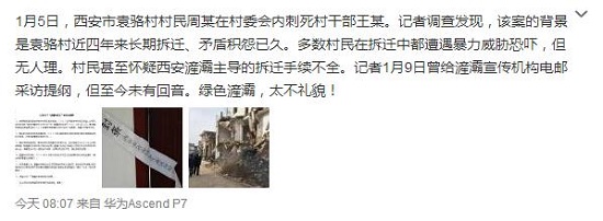 據(jù)新浪微博爆料:1月5日,西安市袁駱村村民周某在村委會(huì)內(nèi)刺死村干部王某。記者調(diào)查發(fā)現(xiàn),該案的背景是袁駱村近四年來長期拆遷、矛盾積怨已久。多數(shù)村民在拆遷中都遭遇暴力威脅恐嚇,但無人理。村民甚至懷疑西安滻灞主導(dǎo)的拆遷手續(xù)不全。記者1月9日曾給滻灞宣傳機(jī)構(gòu)電郵采訪提綱,但至今未有回音。綠色滻灞,太不禮貌!