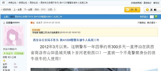 2012年3月以來(lái),這輛警車一年四季約有300多天一直停泊在陜西省商洛市山陽(yáng)縣城關(guān)鎮(zhèn)卜吉河老街西口!一直被一個(gè)不是警察身份的很牛很牛的人使用!
