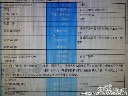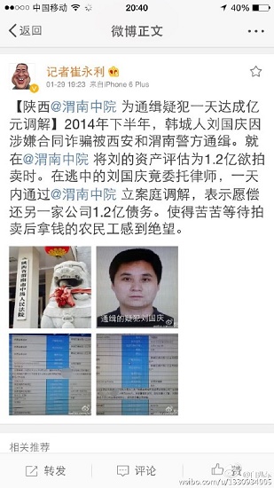 據(jù)新浪微博爆料:去年,韓城人劉國(guó)慶因涉嫌合同詐騙被西安和渭南警方通緝。就在@渭南中院將劉的資產(chǎn)評(píng)估為1.2億欲拍賣(mài)時(shí)。在逃中的劉國(guó)慶竟委托律師,一天內(nèi)通過(guò)@渭南中院調(diào)解,償還另外一家公司1.2億債務(wù)。過(guò)億案件中院也受理?看來(lái)這個(gè)案件水很深。