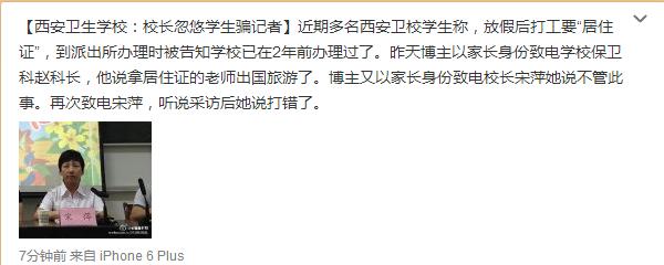 據(jù)新浪微博爆料:近期多名西安衛(wèi)校學生稱,放假后打工要“居住證”,到派出所辦理時被告知學校已在2年前辦理過了。昨天博主以家長身份致電學校保衛(wèi)科趙科長,他說拿居住證的老師出國旅游了。博主又以家長身份致電校長宋萍她說不管此事。再次致電宋萍,聽說采訪后她說打錯了。