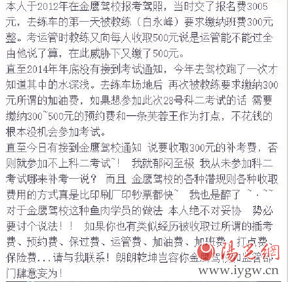 微博大致內(nèi)容為:他(該網(wǎng)友)2012年在榆林市金鷹駕校花了3005元報(bào)了駕照,去練車的第一天被教練要求繳納班費(fèi)300元,考運(yùn)管時(shí)教練又向每人收取500元,并稱能不能過得由教練說了算。直至2014年年底沒有接到考試通知,2014年又去駕校跑了一次,再次被教練要求繳納300元所謂的加油費(fèi),而且想?yún)⒓哟舜?8號科二考試的話,需要繳納300—500元的預(yù)約費(fèi)和一條芙蓉王作為打點(diǎn)。