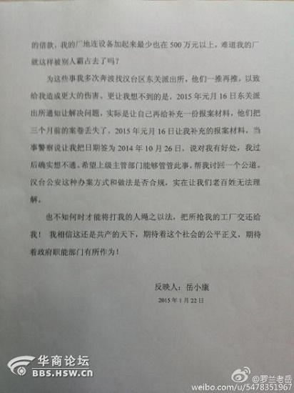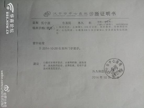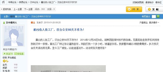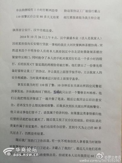 雇兇傷人搶工廠,漢臺(tái)公安80天不作為!2014年12月26日9點(diǎn),胡某因擔(dān)保糾紛約我協(xié)商,見面后搶走我手機(jī)并挾持我到漢中一茶樓,拿出工廠轉(zhuǎn)讓協(xié)議逼我簽字,并毆打我一個(gè)多小時(shí),被逼簽字后,我報(bào)警并確診2根肋骨骨折。多次找漢臺(tái)東關(guān)派出所無(wú)果,至今工廠被搶,兇徒逍遙法外。法治何在天理何在?