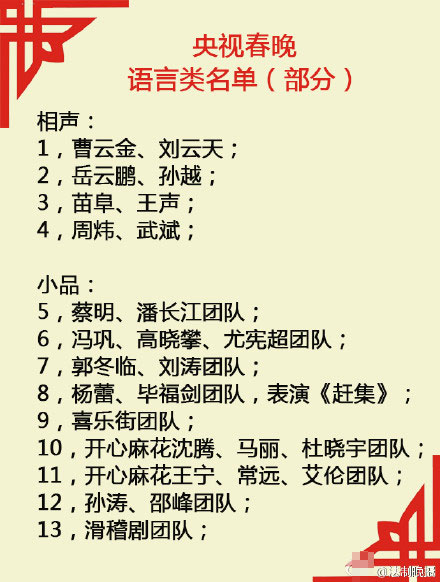 26日早,法制晚報(bào)官方微博發(fā)布消息稱央視春晚相聲小品節(jié)目單曝光。在這份曝光的名單中,畢福劍將搭檔闊別春晚舞臺(tái)11年的“大笑姑婆”楊蕾;蔡明將繼續(xù)搭檔潘長(zhǎng)江;郭冬臨拉上“女神”劉濤;馮鞏組成新團(tuán)隊(duì);曹云金劉云天將表演相聲。