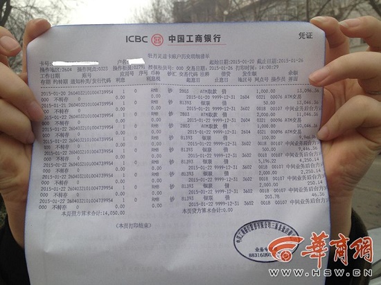 24日下午,她再次到大慶路工商銀行的ATM機(jī)上取錢時,卻發(fā)現(xiàn)卡中僅剩下46元。慌亂之下,她趕緊撥打銀行客服電話掛失了銀行卡。黨女士說,25日上午,她到工商銀行三原支行調(diào)出取款明細(xì),明細(xì)單據(jù)顯示,她卡里的1萬元被人從外地轉(zhuǎn)走的,每次金額數(shù)都不同。