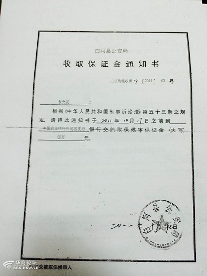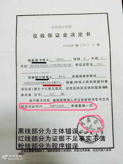 二0一一年九月二一日,本人袁允花因涉及陳勇非法經(jīng)營案,被白河縣公安局作出取保候?qū)彌Q定書,白公經(jīng)保字[2011]01號。取保候?qū)徠谙藜磳脻M之前,白河縣公安局以本人在取保候?qū)徠陂g未經(jīng)執(zhí)行機(jī)關(guān)批準(zhǔn)離開本區(qū)去惠州市為由,沒收取保候?qū)彵WC金人民幣五萬元。本人認(rèn)為白河縣公安局該具體行政行為涉嫌事實(shí)不清證據(jù)不足,理由不成立并且違反法定程序,應(yīng)依法返還被沒收的保證金人民幣五萬元。理由和依據(jù)如下: