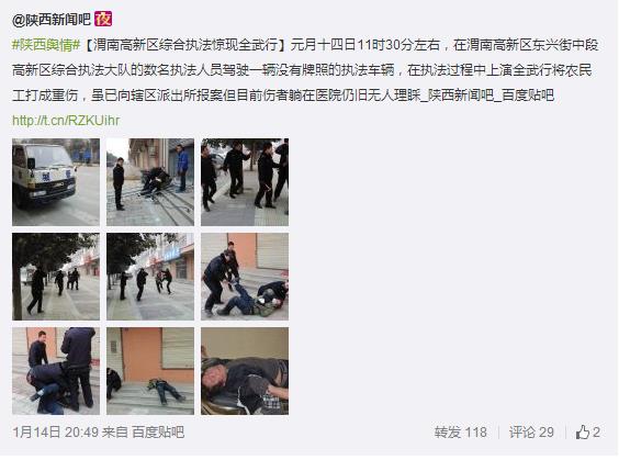 元月十四日11時30分左右,在渭南高新區(qū)東興街中段(渭南技師學院對面)高新區(qū)綜合執(zhí)法大隊的數(shù)名執(zhí)法人員駕駛一輛沒有牌照的執(zhí)法車輛,在執(zhí)法過程中,上演全武行,將農民工打成重傷,雖已向轄區(qū)派出所報案,但目前傷者躺在醫(yī)院,仍舊無人理睬!