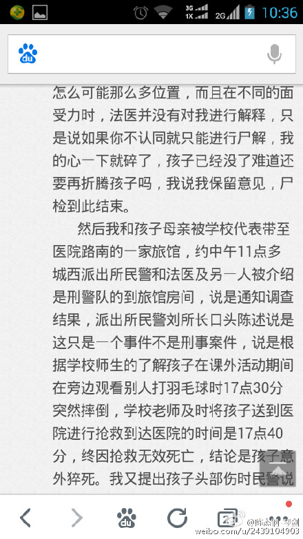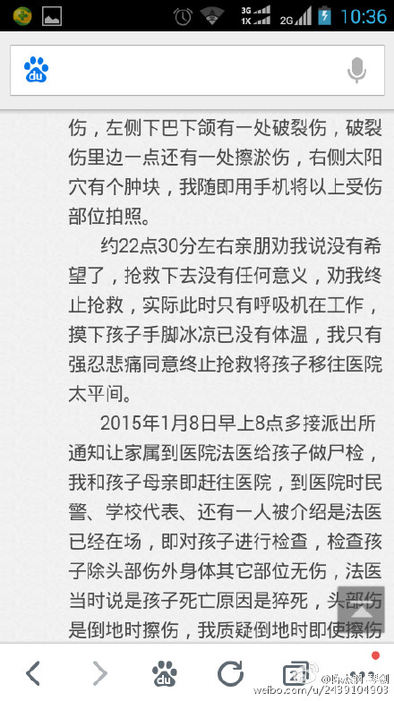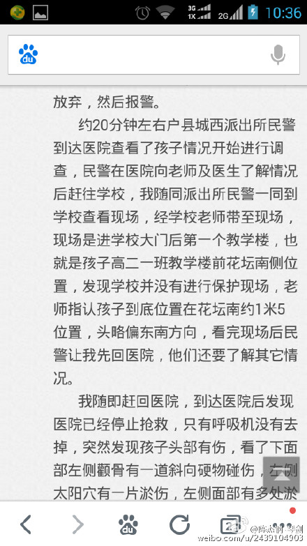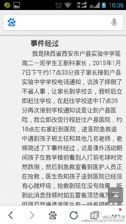 據(jù)新浪微博爆料:【求證】#陜西實驗中學火箭班一花季少年離世之謎#2015年1月7日下午約17點33分戶縣實驗中學高二一班王某某家長接學校電話通知,孩子在學校摔倒不省人事。家長趕到醫(yī)院,孩子已沒有心跳呼吸,家長在孩子頭部發(fā)現(xiàn)有傷。http://t.cn/RZSdRJb @陜西省教育廳