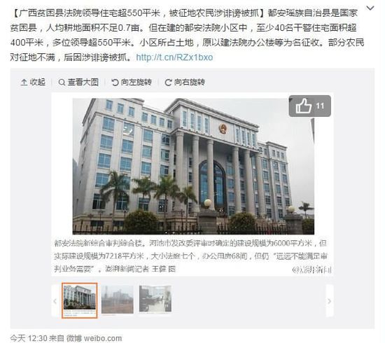 澎湃新聞當(dāng)天早些時(shí)候報(bào)道,國(guó)家級(jí)貧困縣廣西都安瑤族自治縣人均耕地面積不足0.7畝,而都安法院目前在建的都安法院小區(qū)中,至少有四十名干警的住宅面積超過(guò)400平方米,多位領(lǐng)導(dǎo)的在建住宅平均面積更是超過(guò)550平方米。