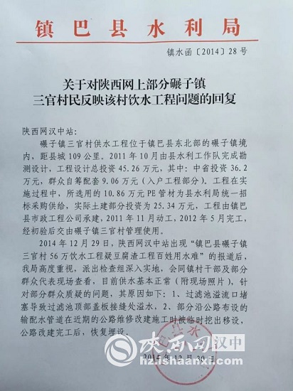 鎮(zhèn)巴水利局關于對部分碾子鎮(zhèn)三官村民反映飲水工程存在問題的回復