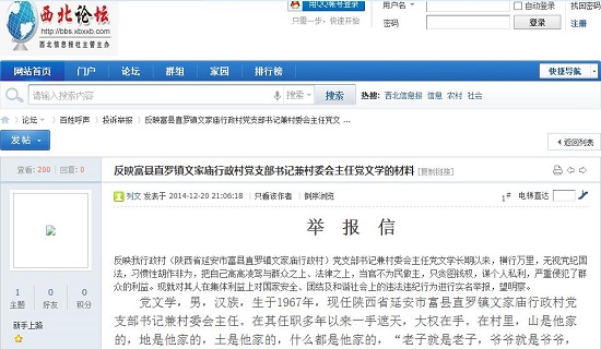 反映我行政村(陜西省延安市富縣直羅鎮(zhèn)文家廟行政村)黨支部書記兼村委會(huì)主任黨文學(xué)長期以來,橫行萬里,無視黨紀(jì)國法,習(xí)慣性胡作非為,把自己高高凌駕與群眾之上、法律之上,當(dāng)官不為民做主,只貪圖錢權(quán),謀個(gè)人私利,嚴(yán)重侵犯了群眾的利益。現(xiàn)就對其人在集體利益上對國家安全、團(tuán)結(jié)及和諧社會(huì)上的違法違紀(jì)行為進(jìn)行實(shí)名舉報(bào),望明察。
