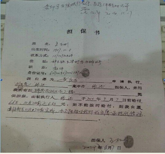 ?2014年6月10日,法院執(zhí)行庭對(duì)被告采取強(qiáng)制執(zhí)行無(wú)果。8月6日,將被告之一張洪帶到執(zhí)行庭,賈姓庭長(zhǎng)不在,由曹法官代辦執(zhí)行,當(dāng)天曹法官對(duì)原告和被告進(jìn)行了法律調(diào)解,某主任給曹法官電話告知讓張洪一個(gè)星期時(shí)間把欠原告的債務(wù)還清,并且是現(xiàn)金,結(jié)果被告張洪不同意,最后經(jīng)調(diào)解,結(jié)果為:被告張洪三個(gè)月還清欠原告的債務(wù),每月還三分之一,只還本金不還利息,同時(shí)有兩位保人保證,并且用兩套房產(chǎn)作為抵押,全部手續(xù)由曹法官辦結(jié)。這期間也沒(méi)給我們看也沒(méi)宣讀,就在我們不知情的情況下,由被告之一的王萬(wàn)剛和法院某主任簽字作保,并說(shuō)以錦界和大柳塔的兩處房產(chǎn)作為抵押,實(shí)際上到調(diào)解結(jié)束我們都沒(méi)看到過(guò)簽字的法律文書,也沒(méi)看到房產(chǎn)抵押手續(xù),只由曹法官的一句承諾,說(shuō)沒(méi)問(wèn)題,要相信法院,相信法律。于是,我們就這樣一次又ー次的被法官所騙,被告也就這樣被放走,直到最后,我們才知道保人之一居然是被告,而且法律文書上就王萬(wàn)剛一人的簽字和手印,根本就沒(méi)有曹法官所說(shuō)的法院某主任。