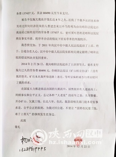 在國家大力推進依法治國的大潮流中,居然依舊有人逆流而上,罔顧是適合公平正義,忘記各種“大老虎”的前車之鑒,頭頂警徽、開辦礦山、欠我工錢、長達(dá)八年。在此,我懇請相關(guān)部門能本著實事求是、公平公正的原則,為我討回公道,不要讓“弱勢農(nóng)民要工錢,難于上青天”的事例發(fā)生在身邊。