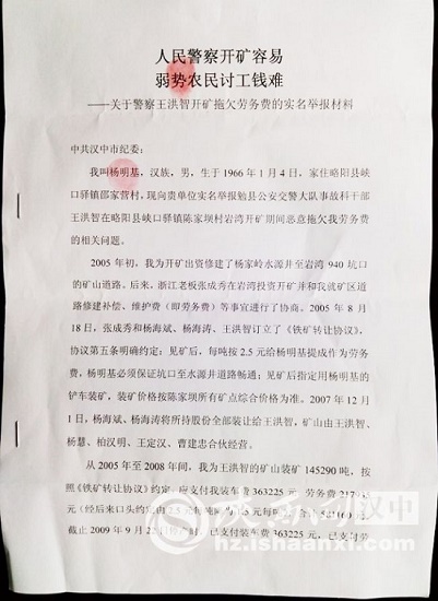 ——關(guān)于勉縣警察王洪智開礦拖欠勞務(wù)費的實名舉報材料