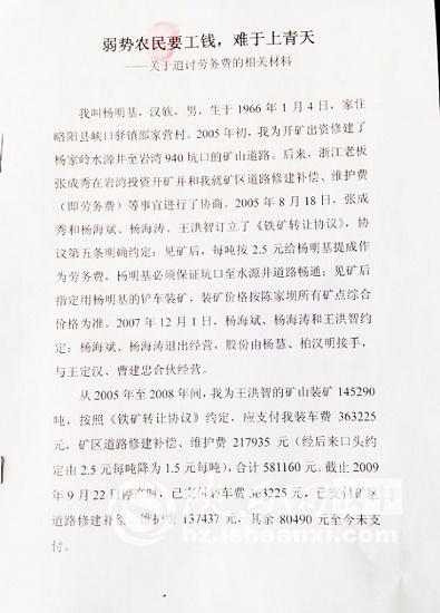 我叫楊明基,漢族,男,生于1966年1月4日,家住略陽縣峽口驛鎮(zhèn)邵家營村,現(xiàn)向貴單位實名舉報勉縣公安交警大隊事故科干部王洪智在略陽縣峽口驛鎮(zhèn)陳家壩村巖灣開礦期間惡意拖欠我勞務(wù)費的相關(guān)問題。