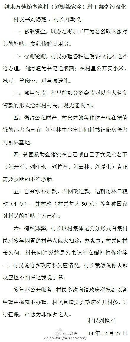 【實(shí)名舉報(bào)村官】陜西神木縣萬(wàn)鎮(zhèn)楊辛灣村(陜西省人大代表知名企業(yè)家劉銀娥家鄉(xiāng)),村支書(shū)劉海耀、村長(zhǎng)劉朝義,貪污腐化、橫行鄉(xiāng)里、魚(yú)肉百姓,村民懇請(qǐng)上級(jí)黨委政府進(jìn)行查賬、公開(kāi)村務(wù),嚴(yán)懲蛀蟲(chóng),打通服務(wù)群眾的“最后一公里”,還楊辛灣村和諧和寧?kù)o。