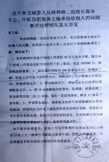 說完,李衛(wèi)斌隨手從兜里掏出了一張紙,告訴記者;這是高橋街道辦“關于李衛(wèi)斌等人反映韓麻二組組長賬務不公開、私自把集體土地承包給別人的問題事項處理情況意見的一個答復”。其中的一個問題是:“你反映灃河改造征地組上預留的30萬元去向不明。情況如下:經組上代表會議研究決定用于村上修廟,花去185000元。剩余錢在財政所”。
