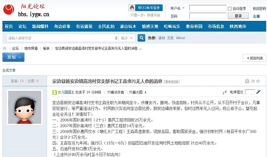 定邊縣新安邊鎮(zhèn)高灣村支書王森任職九年期間至今,涉嫌貪污,挪用,偽造假賬,村務從不公開,從不召開村子會議,凡事密密進行,等嚴重違法行為。 村民數(shù)次實名向定邊縣紀委,新安邊鎮(zhèn)府舉報,但時過兩年無人過問,現(xiàn)公希于眾,望引起全社會關注!詳情如下: