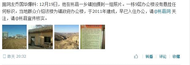 據(jù)新浪微博爆料:【中央八項規(guī)定出臺后陜西彬縣政府樓依然蓋起】據(jù)網(wǎng)友爆料:12月19日,他們記者在彬縣一鄉(xiāng)鎮(zhèn)拍攝到一組照片。一棟9層辦公樓沒有懸掛任何標(biāo)識。當(dāng)?shù)厝罕娊榻B該樓為鎮(zhèn)政府辦公樓,于2011年建成,早已入住辦公!彬縣政府這是在抵制中央八項規(guī)定!圖中還顯示彬縣農(nóng)村有的地方還沒脫貧!