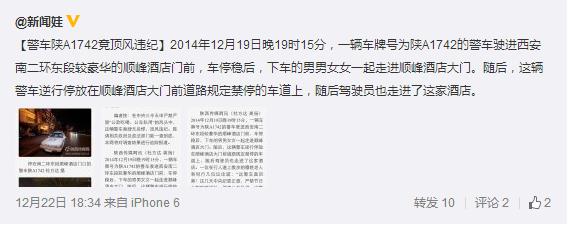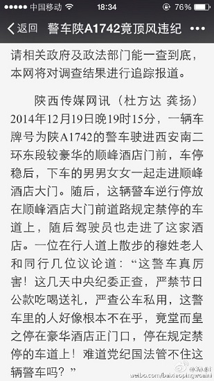 【警車陜A1742竟頂風(fēng)違紀(jì)】2014年12月19日晚19時(shí)15分,一輛車牌號(hào)為陜A1742的警車駛進(jìn)西安南二環(huán)東段較豪華的順?lè)寰频觊T前,車停穩(wěn)后,下車的男男女女一起走進(jìn)順?lè)寰频甏箝T。隨后,這輛警車逆行停放在順?lè)寰频甏箝T前道路規(guī)定禁停的車道上,隨后駕駛員也走進(jìn)了這家酒店。