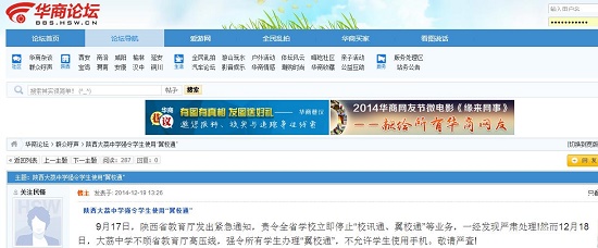 9月17日,陜西省教育廳發(fā)出緊急通知,責(zé)令全省學(xué)校立即停止“校訊通、翼校通”等業(yè)務(wù),一經(jīng)發(fā)現(xiàn)嚴(yán)肅處理!然而12月18日,大茘中學(xué)不顧省教育廳高壓線,強(qiáng)令所有學(xué)生辦理“翼校通”,不允許學(xué)生使用手機(jī)。敬請(qǐng)嚴(yán)查!