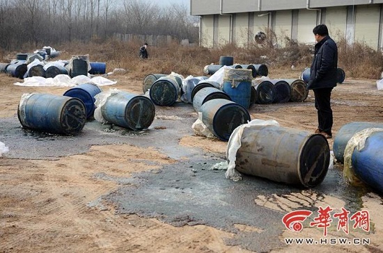 昨日早晨,家住藍田縣白羊寨村的胡女士,一打開自家窗戶就被眼前的景象嚇了一跳:樓下一片空地,突然冒出許多藍色塑料桶,似乎還有液體流出?!斑h遠地就能聞到一股酸味,嚇得我趕緊把窗戶關上了?!弊蛉丈衔?0時許,在白羊寨村一處空地上,散落著百余只藍色塑料桶?!?7號晚上10時許,我睡得迷迷糊糊的,聽到有大貨車卸貨的聲音?!备浇姾干虘艄と送鯉煾嫡f。還有商戶說,早上開門時,看到塑料桶散落在地上,因為味道太大,他也不敢靠近看。