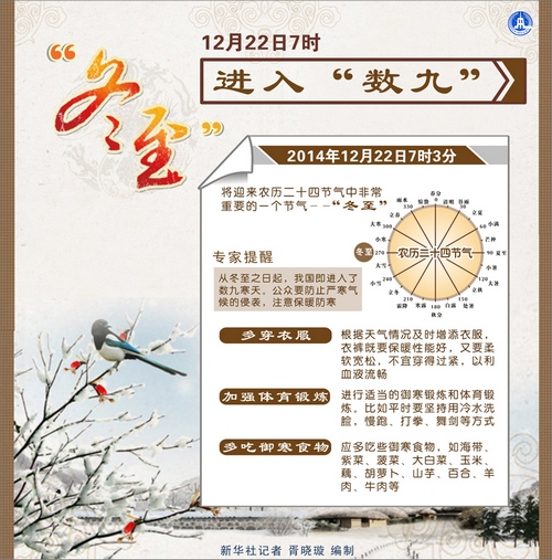 22日7時3分,將迎來農(nóng)歷二十四節(jié)氣中非常重要的一個節(jié)氣--“冬至”,從這一天起開始“進九”,我國步入嚴寒季節(jié)。冬至過后,我國各地氣候都進入一個最寒冷的階段,也就是人們常說的“數(shù)九寒天”。