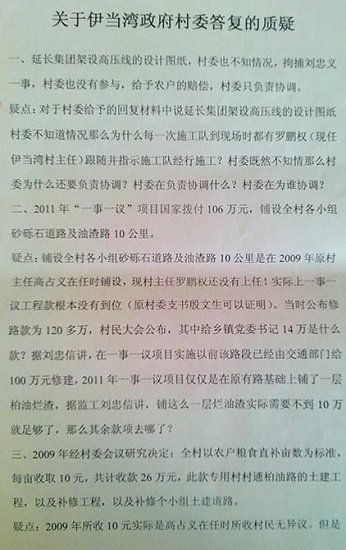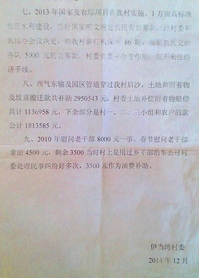 記者于2014年12月12日進(jìn)行調(diào)查村主任貪腐問(wèn)題,見(jiàn)到伊當(dāng)灣現(xiàn)任村主任羅鵬權(quán),村民反映的問(wèn)題我們所有開(kāi)支都有票據(jù),有據(jù)可查。既然有據(jù)可查可是據(jù)村民反映,每年收入和支出我們村民都不知道,村務(wù)不公開(kāi)。老百姓質(zhì)疑款項(xiàng)開(kāi)支的去向。關(guān)于“一事一議”專(zhuān)項(xiàng)工程,羅主任;“專(zhuān)款沒(méi)有落實(shí)專(zhuān)用”我確實(shí)有責(zé)任。據(jù)西部大開(kāi)發(fā)雜志社報(bào)道此事事以后,事情一直沒(méi)有得到解決。