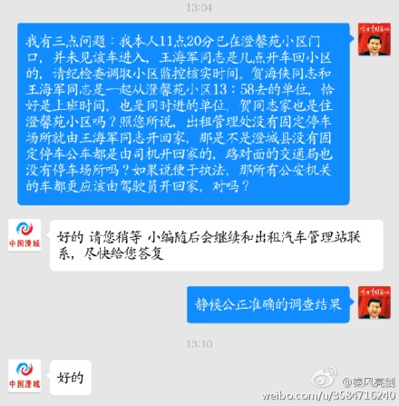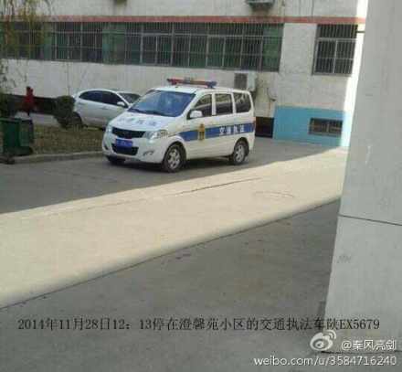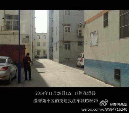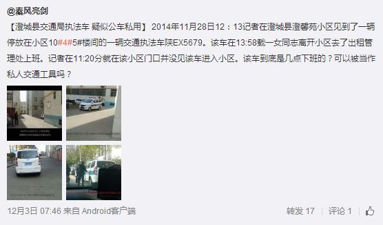 據(jù)新浪微博爆料:【澄城縣交通局執(zhí)法車疑似公車私用】2014年11月28日12:13記者在澄城縣澄馨苑小區(qū)見到了一輛停放在小區(qū)10#4#5#樓間的一輛交通執(zhí)法車陜EX5679。該車在13:58載一女同志離開小區(qū)去了出租管理處上班。記者在11:20分就在該小區(qū)門口并沒見該車進入小區(qū)。該車到底是幾點下班的?可以被當作私人交通工具嗎?