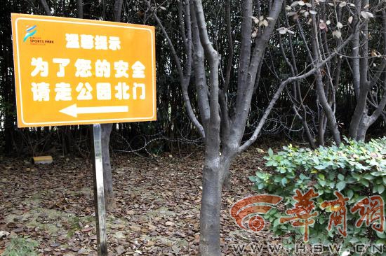 上午10時許,華商記者來到鳳城九路上的西安城市運動公園北門附近,由西向東走在人行道上,公園沒有圍墻,靠近路邊的一片樹林,從路邊往樹林里走上兩三步,便出現(xiàn)一條像是被人踩出來的小路,而想要從小路上直接再往樹林里就無法前進了,有一道距離地面近1米高的環(huán)形鐵絲網(wǎng)圍欄,鐵絲網(wǎng)上帶著刺,根本無法穿過樹林進入公園內(nèi)。