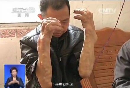 【廣西大新一村莊被重金屬污染村民手腳畸形】廣西大新縣五山鄉(xiāng)三合村常屯,村民黃貴強雙臂長滿大小不一的疙瘩,手指嚴(yán)重變形,伸直和過度彎曲都引發(fā)疼痛;46名村民尿鎘檢驗中僅3人正常。1954年原大新鉛鋅礦開采,每隔一段時間就有廢水和尾礦漫灌田里,耕地、農(nóng)作物被重金屬污染。